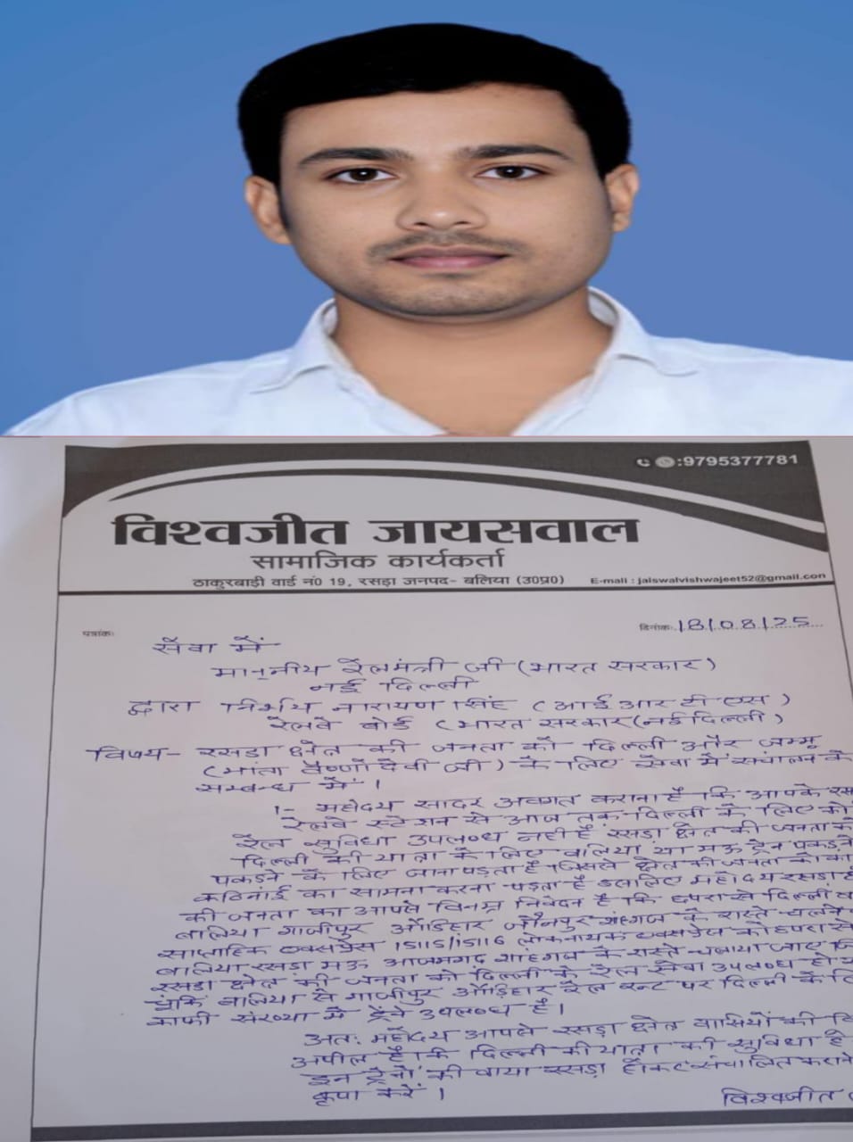 उन्होंने कहा कि गाजीपुर रेलवे लाइन पर पहले से ही जम्मू जाने के लिए ट्रेन है जबकि रसड़ा से एक भी ट्रेन नहीं है। इसके अलावा उन्होंने लोकनायक एक्सप्रेस जो वाया गाजीपुर चलती है उसे बलिया- रसड़ा -मऊ- आजमगढ़ के रास्ते शाहगंज से दिल्ली तक चलाने की मांग किया है।
