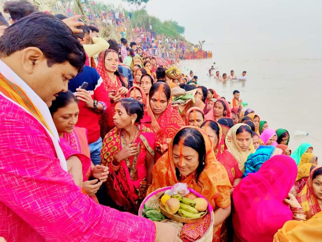 वहीं अपनी वर्षों की परम्परा को निभाते हुए भाजपा से जमानिया की पूर्व विधायक सुनीता सिंह ने भी महा व्रत रखा। छठ पूजा के नियमों का पालन करते हुए है वर्ष की तरह इस बार भी हाथ में कलश लिए वो पैदल ही घाट पर पहुंची। उनके पीछे उनके परिवार के सदस्य सर पर प्रसाद का सारा सामान लेकर चल रहे थे।