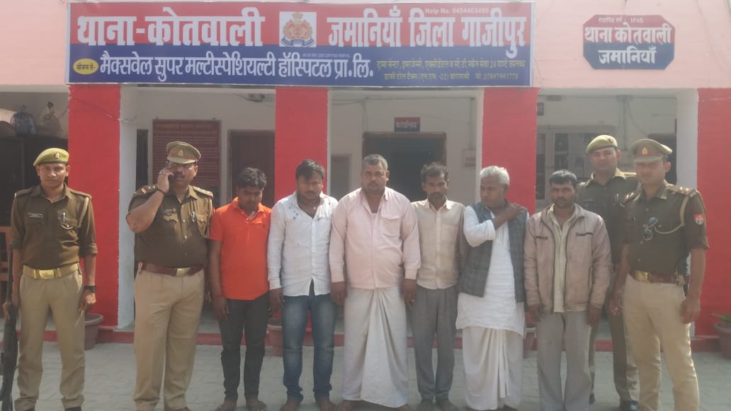 गिरफ्तार अभियुक्तों के नाम (1) सुभाष पाल पुत्र चंद्रमा पाल निवास जीवपुर थाना जमानिया जनपद गाजीपुर उम्र 52 वर्ष। (2) गुड्डू यादव पुत्र स्वर्गवास कमला यादव निवास रामपुर पट्टी सरनाम खां थाना जमानिया जनपद गाज़ीपुर उम्र 42 वर्ष। (3) सुनील पाल पुत्र ब्रम्हा निवास जीवपुर थाना जमानिया जनपद गाजीपुर उम्र 22 वर्ष। (4) पिंटू यादव पुत्र गोवर्धन यादव निवास। सब्बलपुर खुर्द थाना जमानिया जनपद गाजीपुर 24 वर्ष। (5) शैलेन्द्र राम पुत्र गोवर्धन यादव निवास धनईपुर थाना नोनहारा जनपद गाज़ीपुर उम्र 30 वर्ष। (6) शिवाराम पुत्र उपेंद्र निषाद निवास जीवपुर थाना जमानिया जनपद गाजीपुर उम्र 27 वर्ष।