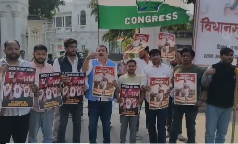 लखनऊ [Lucknow] में कांग्रेस पार्टी कार्यालय [Congress Party Office] के बाहर NSUI [National Students’ Union of India] के कार्यकर्ताओं ने प्रधानमंत्री नरेंद्र मोदी [Narendra Modi] के विरोध में प्रदर्शन किया। कार्यकर्ताओं ने हाथों में प्रधानमंत्री का पुतला लेकर नारेबाजी की और कांग्रेस कार्यालय से सड़कों पर प्रदर्शन करते हुए निकल गए।